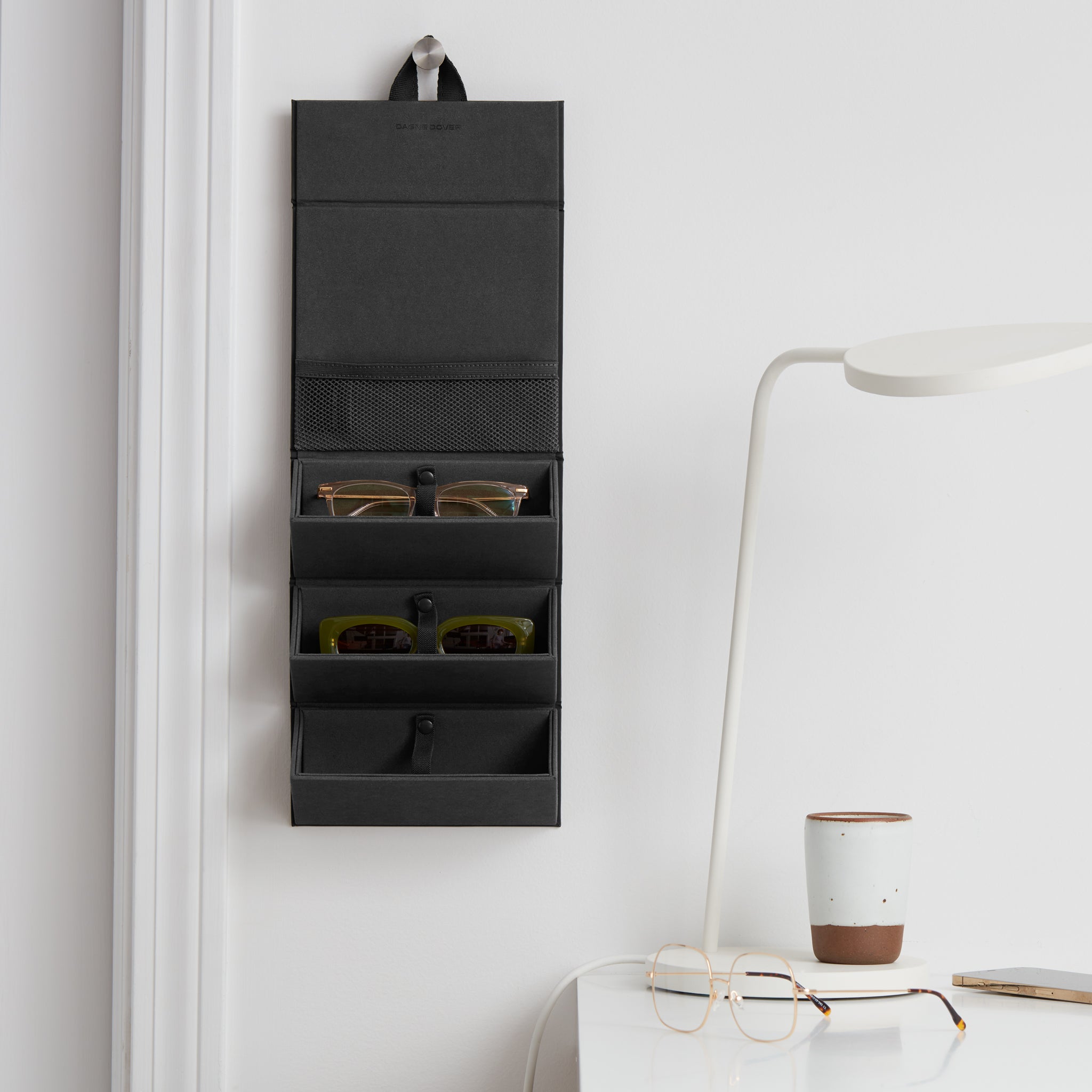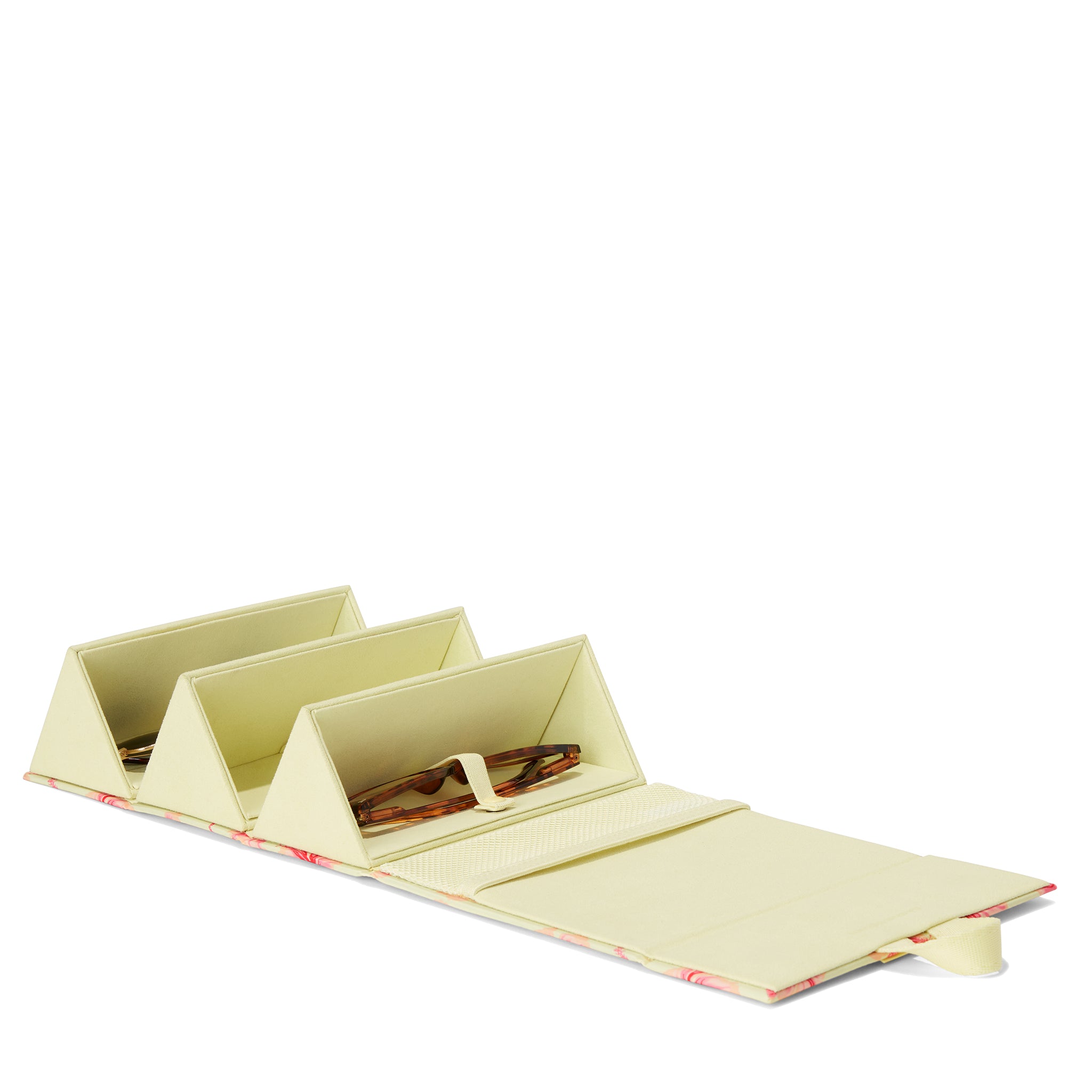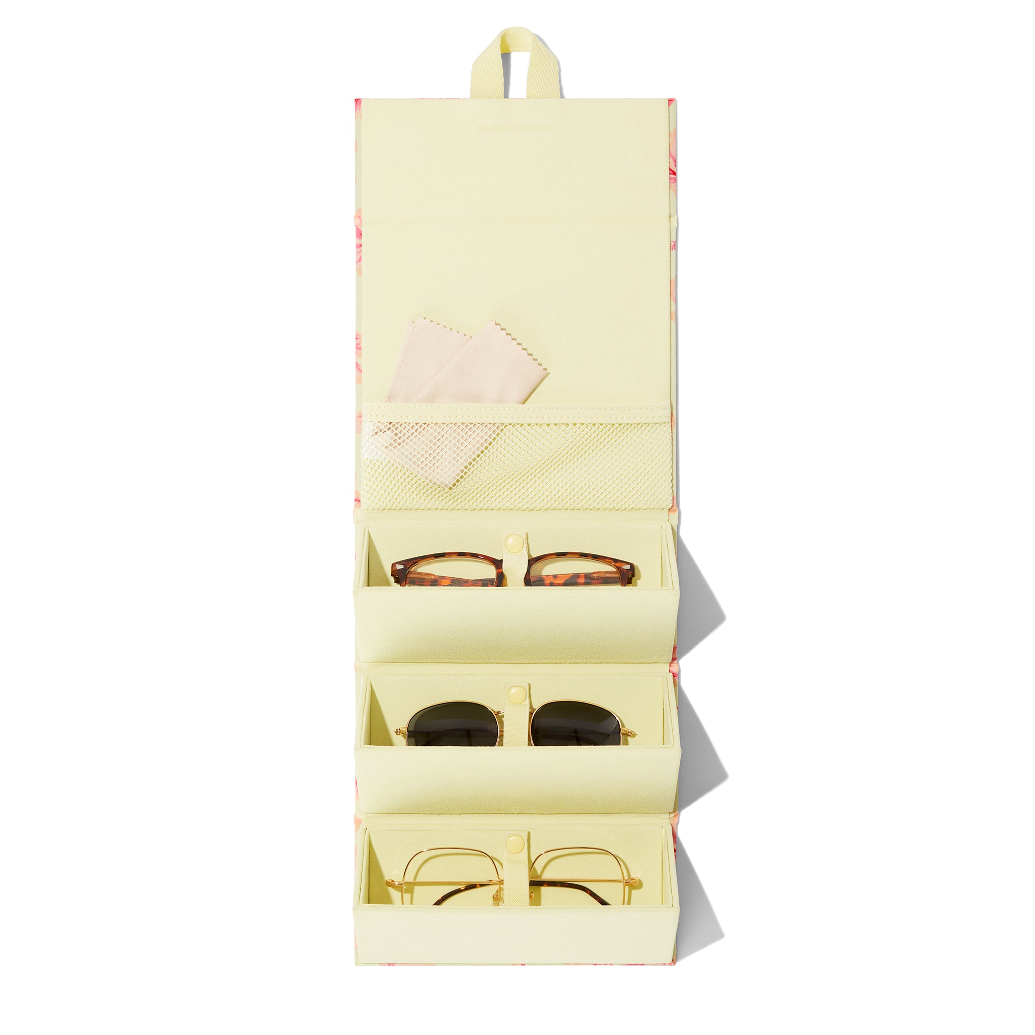 Some moments call for cat eyes, and others are for aviators. The Remi Glasses Case was made for bringing your shades and frames from here to there and back again. This foldable sunglasses travel case features a chic geometric silhouette with magnetic closure that stores up to 3 pairs securely. Skip the scratches with an ultra-soft microfiber lining and elastic straps to keep everything in place. This smartly designed eyeglass holder includes a convenient interior mesh pocket for little extras and a hook for hanging when it’s unfolded. Designed with eco-friendlier Repreve® materials featuring a luxe, subtle shine.